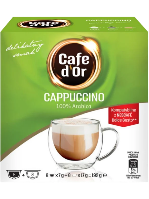 Kapsułki Cafe D’Or to połączenie świeżo mielonej kawy i precyzyjnie dobranej porcji, gwarantujące powtarzalność smaku. Idealne do ekspresów kapsułkowych. Kompatybilność z ekspresami z Dolce Gusto ®